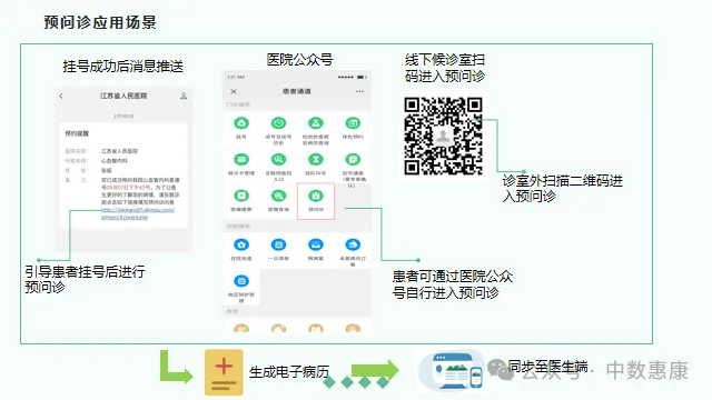 优化就医流程,实现诊前问诊和电子病历的结合。患者完成挂号后的等待时间内,进入公众号中的智能AI问诊模块,系统通过模拟医生问话,引导式交互自我采集患者发病诱因、发病时间、伴随症状等主观病史以及诊疗过程、既往病史、过敏史、个人史等客观病史信息,系统自动生成符合规范的标准门诊病历,并在患者与医生见面之前推送给医生。
